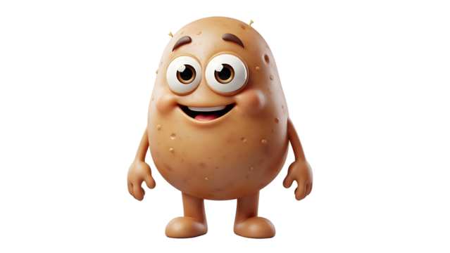 Playful potato cartoon character featuring a bright smile and expressive eyes. Smooth textures and clean shading, perfectly centered and isolated on a solid white background.