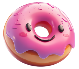 Happy pink frosted cartoon donut with sprinkles fun and playful dessert illustration, isolated on transparent background, cut out