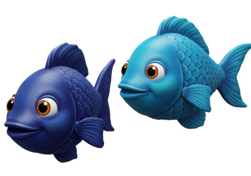 Isolated cartoon style fish character illustrations in shades of blue, a cute pair