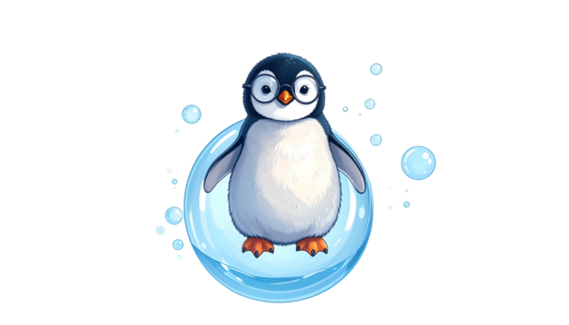 Animated penguin holding a bubble wand with a butterfly inside, surrounded by butterflies