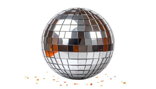 A Shimmering Silver Disco Ball Hanging in Suspended Animation on a Clear PNG or White Background.