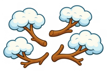 Cartoon snowy tree branches set isolated, winter nature elements for games and animation, transparent background