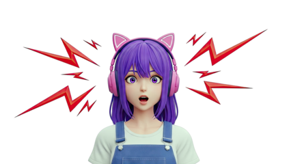 Cartoon character with cat ears, blush, smiling, green foliage, white butterfly, black background