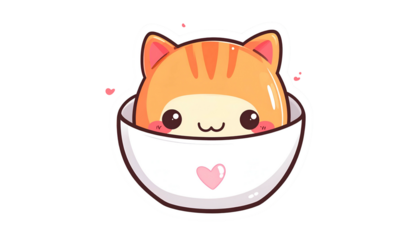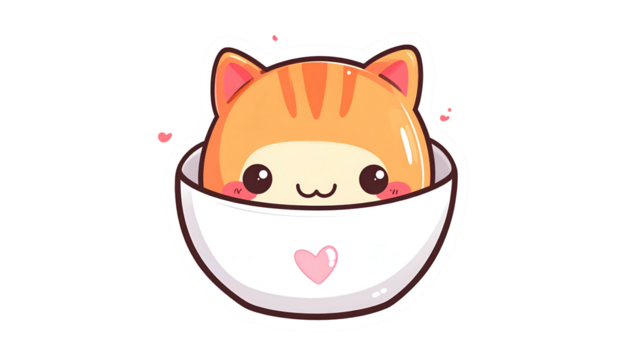A cute, cartoon orange tabby cat peeks out from a white bowl with a pink heart
