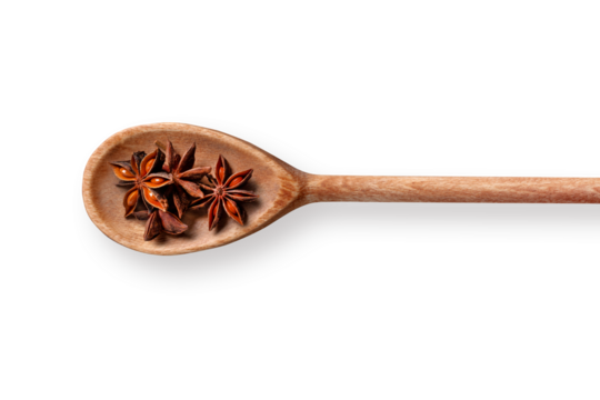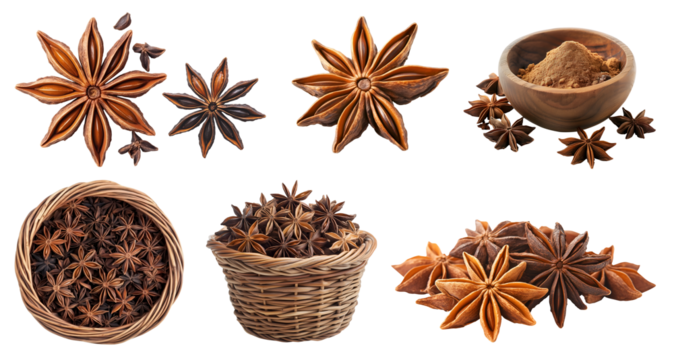 Star anise, Illicium verum fruit herb spice, many angles and view side top front basket bowl powder pile isolated on transparent background cutout, PNG file. Mockup template for artwork graphic design