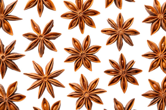 Multiple star anise pods arranged pattern, warm brown culinary spice botanical decoration, isolated on a transparent background