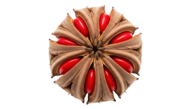 Isolated Illicium verum seed pod, with red seeds inside, a spice used in cooking and medicine