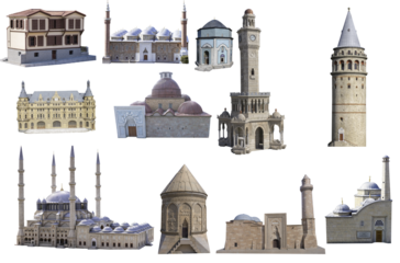 Mixed istanbul isolated Set . Transparent PNG suleymaniye mosque, bursa mosque, izmir tower, isolated background. istanbul mosque white PNG background