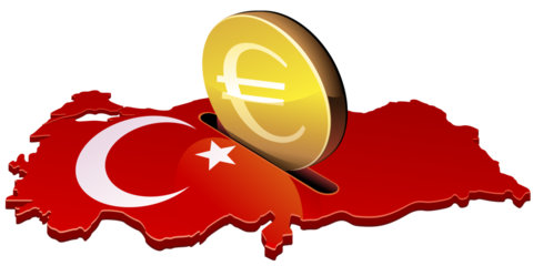 3D map of Turkey in the colors of the Turkish flag with the crescent and the star with a slotin which a gold coin with the euro symbol is deposited (cut out)