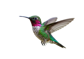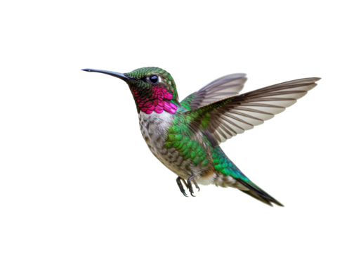 Anna s hummingbird flying PNG isolated on transparent background, colorful bird with iridescent pink throat and green body, wildlife photography