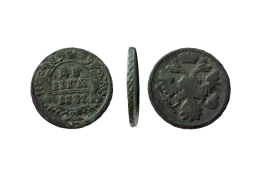 money of 1737. Ancient Russian coin during the reign of Empress Anna Ioannovna, isolate, transparent background