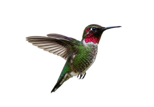 Isolated Anna's hummingbird with iridescent gorget, full spread wings, and no background