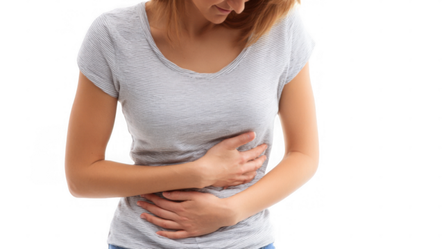 Man experiencing intense abdominal discomfort, holding his stomach with both hands, suggesting appendicitis inflammation, isolated on transparent background
