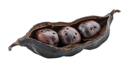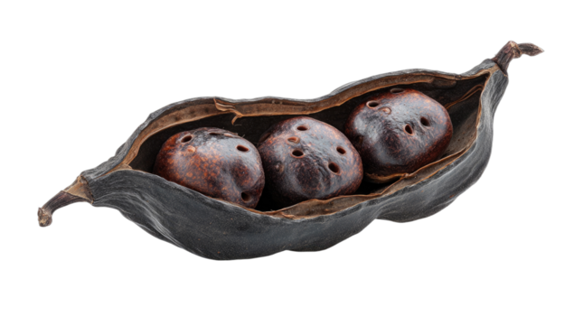A dark, withered seed pod splits open to reveal three brown, pitted seeds