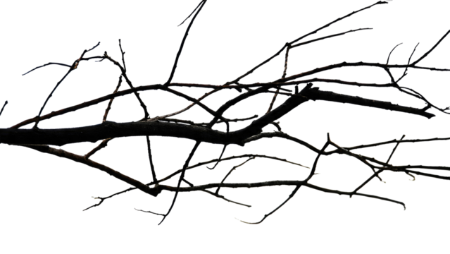 A stark, leafless tree branch with numerous dark, thin twigs extends horizontally against a solid transparent background, showing its intricate silhouette. background removed