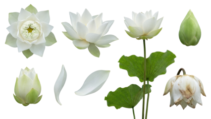 White Lotus Set: Isolated Illustration with Buds, Bloom, and Withered Flower