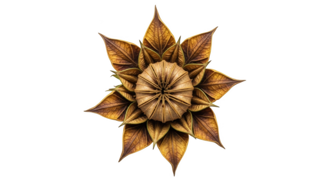 Dried brown seed pod with radiating pointed leaves on black background botanical nature