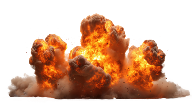 Massive Explosion (Orange Flames, Brown Smoke) on Stark White Background �C Reveals Scattered Detritus, PNG, no background