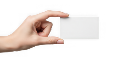 A hand holding a blank white business card on an isolated white background for corporate or personal use with template and marketing and communication