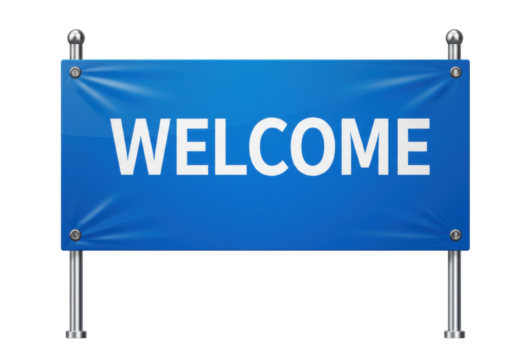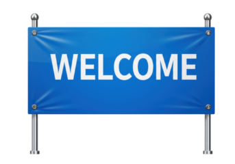 Isolated blue Welcome banner on metal supports, vector display announcement design template
