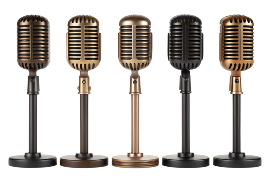 Elegant assortment of five vintage-style condenser microphones for broadcasting and recording, showcasing a classic design in different metallic finishes