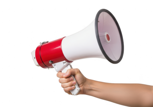 Hand holding a red and white megaphone isolated on transparent background