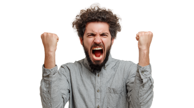 Man expressing anger and frustration with raised fists, isolated on white background.