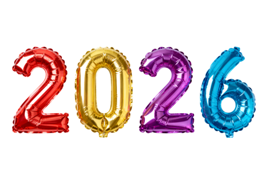 Colorful foil balloons in red, gold, purple, and blue form the year 2026, suitable for festive occasions.