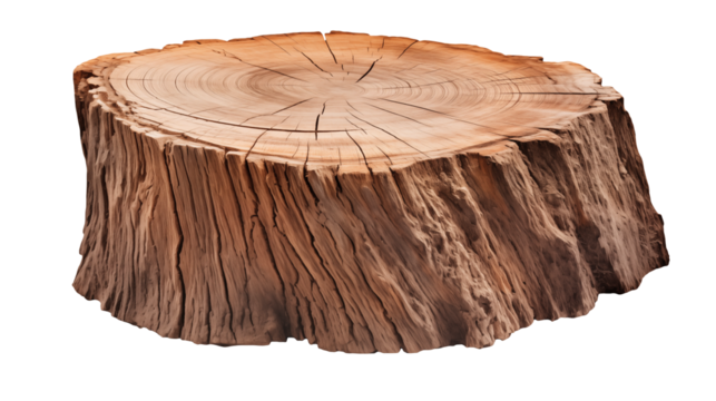 Brown wood tree stump shows annual growth rings on transparent backdrop