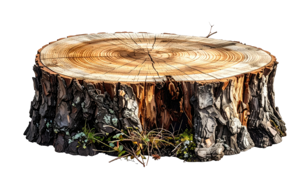 Weathered tree stump revealing detailed annual rings, showcasing natural wood texture against transparent backdrop