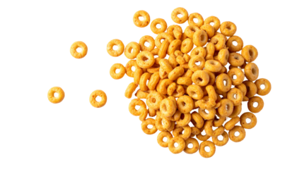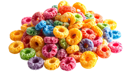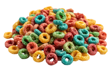 Vibrant multi-colored ring-shaped breakfast cereal pieces, crisp, falling against a transparent background with copy space, concept for a cheerful breakfast advertisement