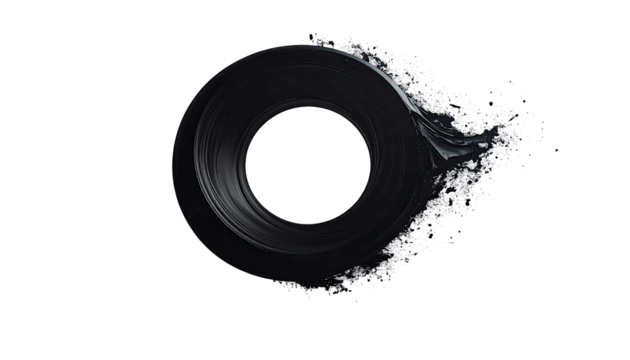 Abstract ring-shaped form on black background, with a dark, textured ring, and a trail of glittery particles streaming outward
