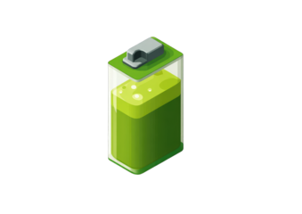 Isometric illustration of a rectangular battery with a transparent casing showcasing vibrant green energy inside, suggesting a high-energy or eco-friendly power source