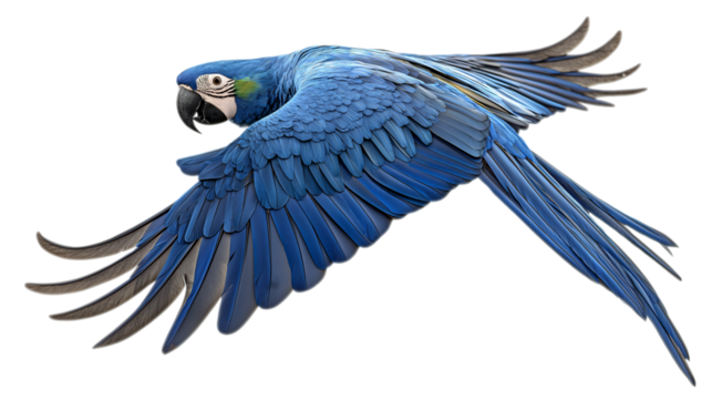 Isolated Hyacinth Macaw bird with wings spread, vibrant blue plumage, tropical wildlife