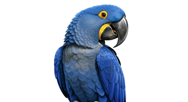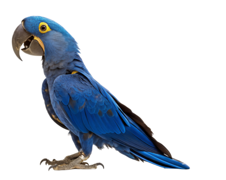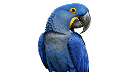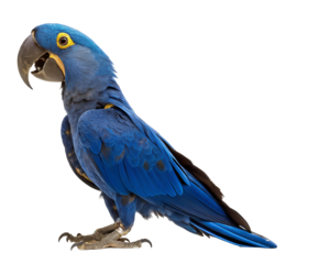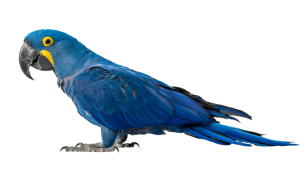 The hyacinth macaw is the largest macaw and flying parrot species. The beautiful blue parrot suffers a lost in population due to pet trade and habitat loss. Isolated on transparent, clipping path
