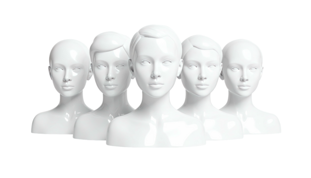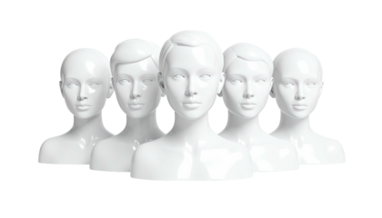 Five glossy white mannequin busts arranged in a tight group