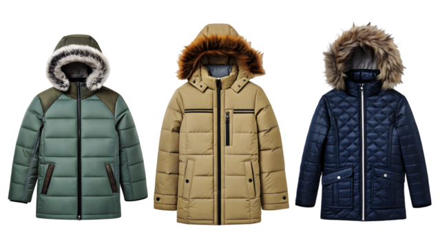 A warm orange and black puffer jacket isolated on white background, a thick down coat with hood, winter fashion clothing concept, an insulated outerwear mockup.