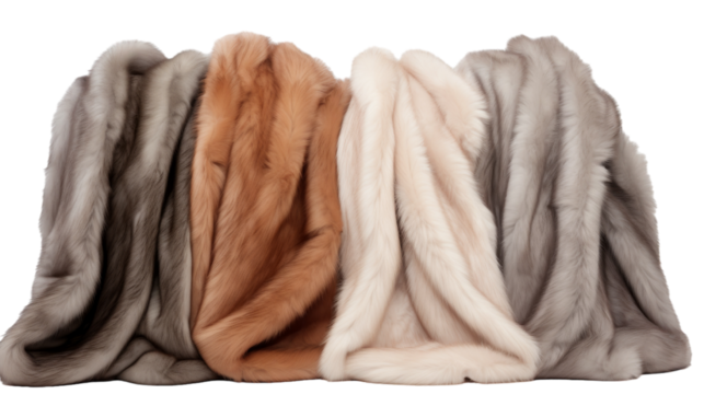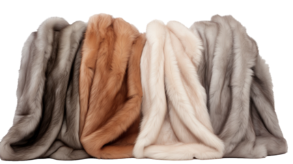 A whimsical pile of furs perched precariously on top of one another, creating a playful tower of textures