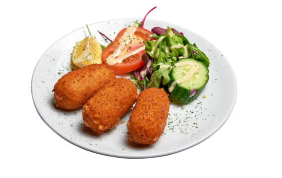 White plate with three Shrimps croquettes ans salad. on white and transparent background. Ai generated