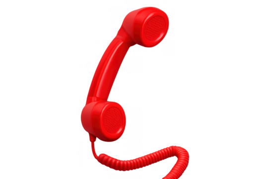Vibrant red telephone receiver with coiled cord set against a stark transparent and white background, concept for urgent communication, emergency services and customer support.