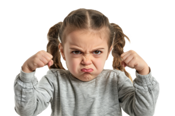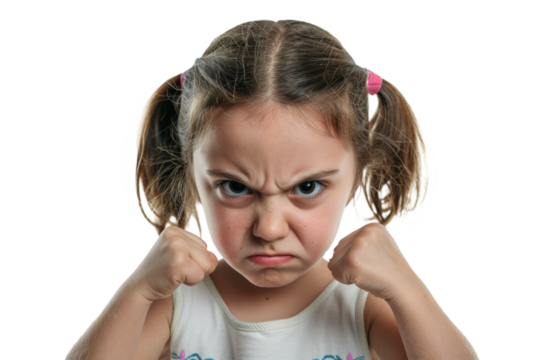An angry little girl with clenched fists and furrowed brows, expressing her emotions.