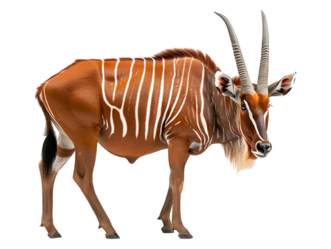 A reddish-brown male nyala antelope with spiral horns and white stripes stands gracefully, isolated on a transparent background