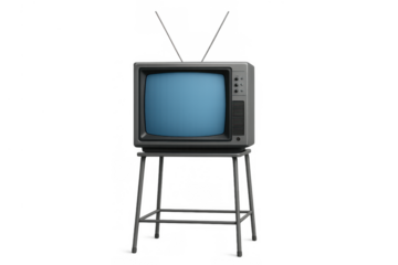 Vintage television set displaying a blue screen, featuring a retro design with rabbit ear antenna on top and sitting on a metal stand