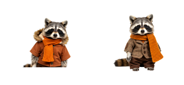 Two adorable raccoons dressed in stylish autumn jackets and cozy orange scarves look directly at the camera in a charming anthropomorphic character portrait set