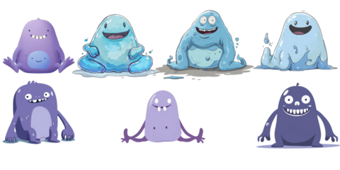 cartoon drawing of an anthropomorphic blue slime creature smiling, sitting on the ground, full body shot, white background,