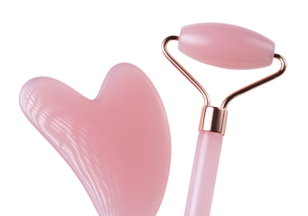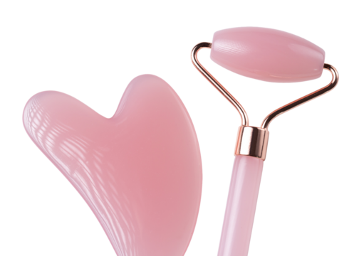 Pink Gua Sha massage tool on a white background, close-up. Rose Quartz jade roller.