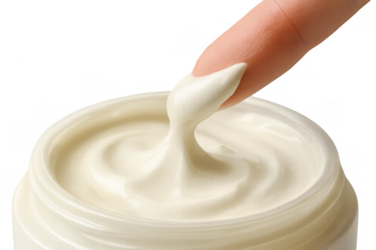 Finger dipping into jar of beauty cream, applying moisturizing lotion for skincare and healthy skin on transparent background