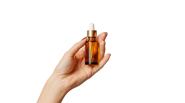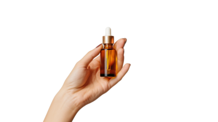 Hand holding oil serum , dropper isolated on white background