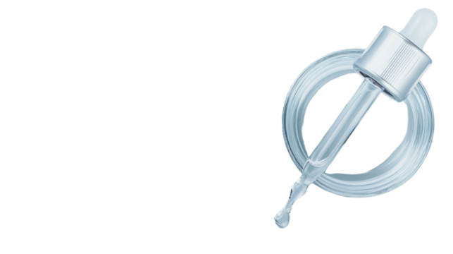 Glass dropper and bottle opening dripping serum on transparent background