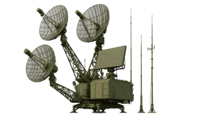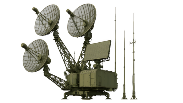 Ultra-High Definition Anti-Aircraft Missile Defense Radar Array with Rotating Dishes and Communication Antennas PNG